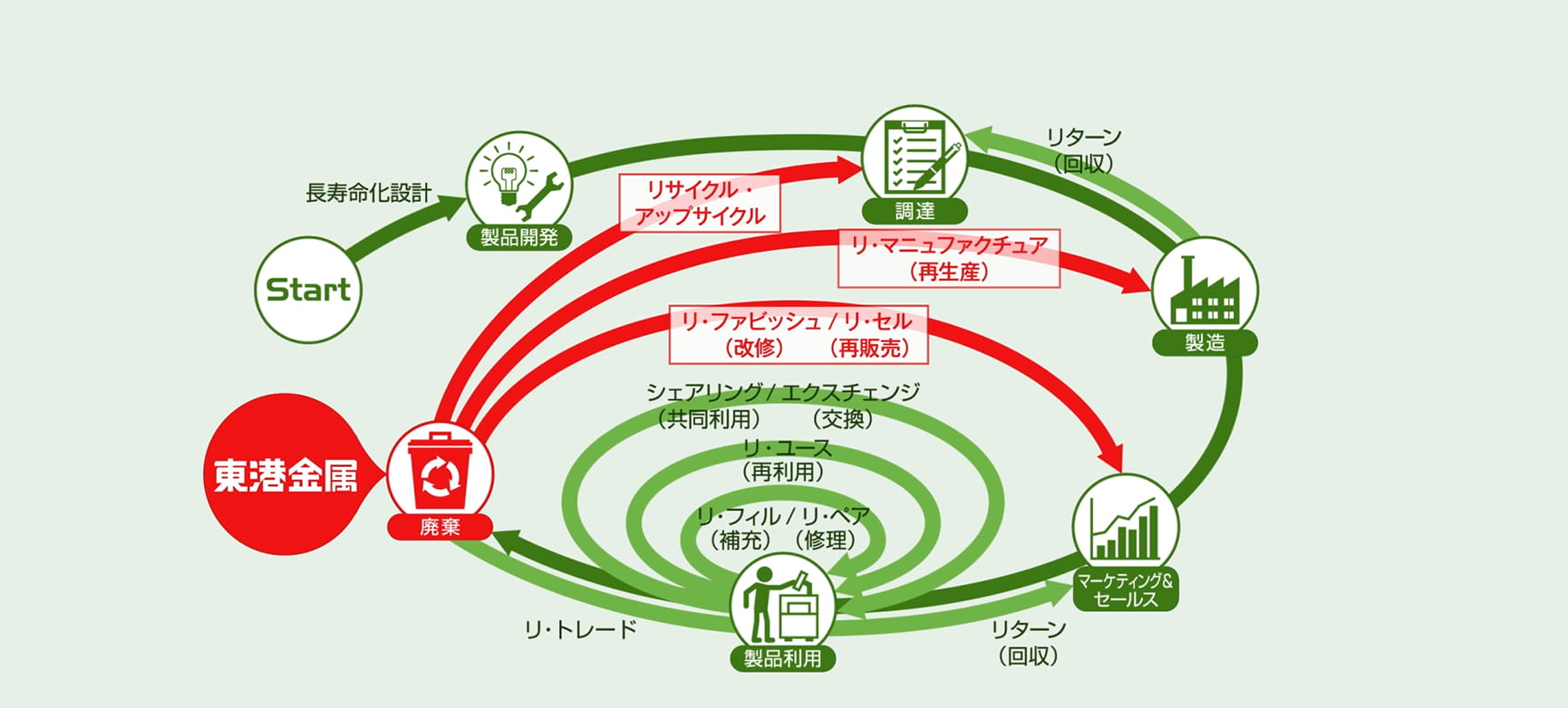 従来のリサイクル事業のみならず、リユース、リメイク、リビルド、リマニファクチャリングなどあらゆるループを推進する。