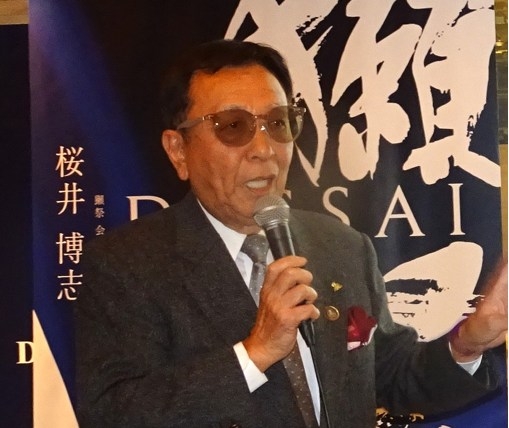 次にモスフードサービスの前会長、櫻田厚氏が登壇。「弘兼先生の紹介で桜井会長と御縁を頂きました。獺祭は日本の誇り。メイド イン ジャパンを発信する企業として、1000億円企業となることを期待しています」とエールを送った。