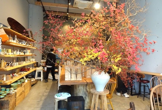 全国の伝統工芸品や食品が並ぶギャラリーとの中間の壺には、真っ赤なもみじが秋を奏でる。これも日にちとともに少しずつ変化し、季節の移ろいを感じさせてくれるのであろう。