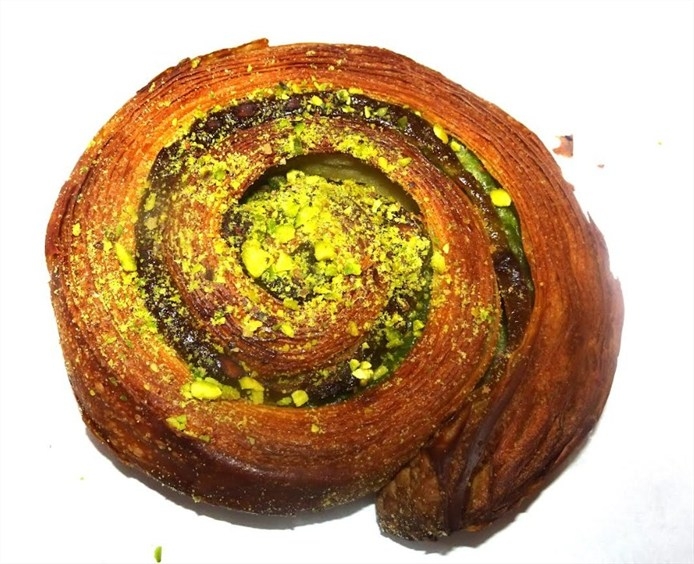 「ピスタチオのエスカルゴ」は美しく、ザクザクの食感の生地と、巻き込んだピスタチオフィリングの上品な甘さ、刻んだピスタチオの味わいに虜になる。どれも五十嵐シェフの技術の高さがうかがい知れる。