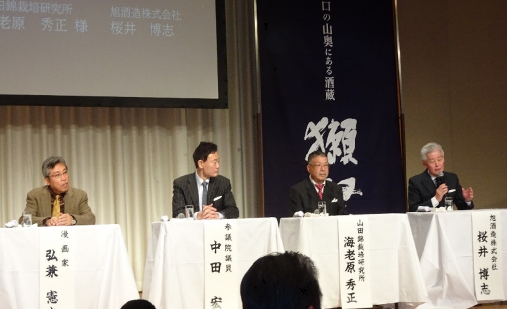 壇上には旭酒造の桜井博志会長、特別審査員を務めた漫画家の弘兼憲史氏、参議院議員の中田宏氏、農家で山田錦栽培研究所の海老原秀正氏の4人が登壇、熱い議論が始まった。