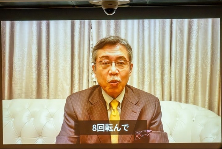 続いて漫画家の弘兼憲史氏がビデオで登場した。弘兼氏と桜井会長は同郷で同世代。互いに熱い友情で結ばれ、桜井会長のイベントには欠かさず出席、エールを送る仲だ。獺祭の漫画も多数執筆している。この日はやむをえない事情だったのだろう、それでも動画で登場するからすごい。